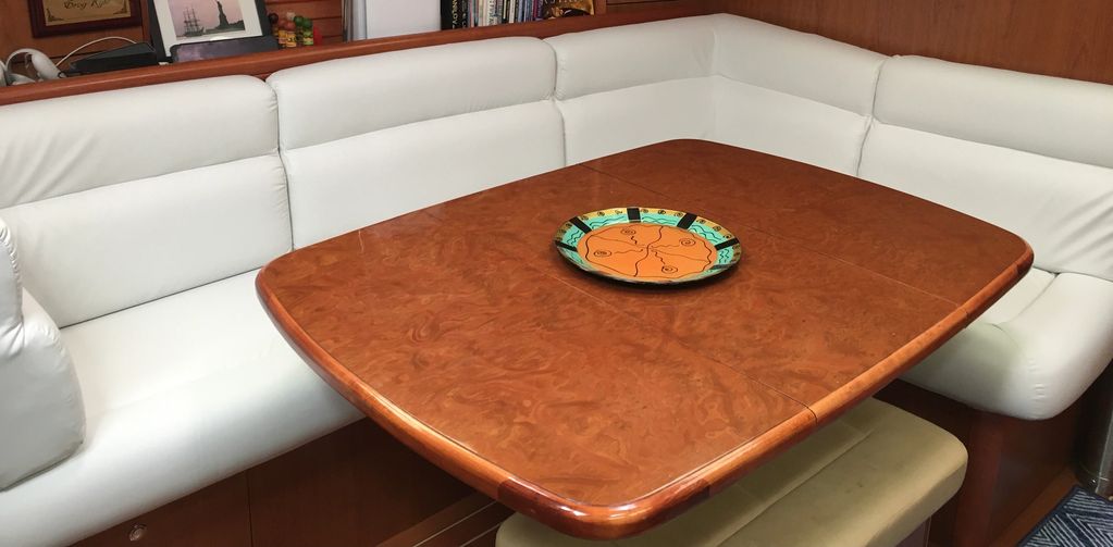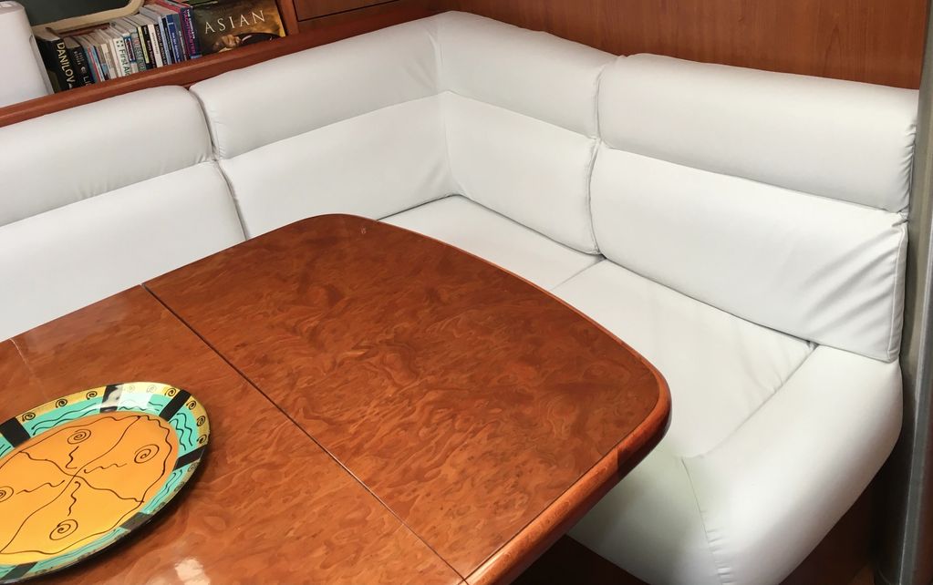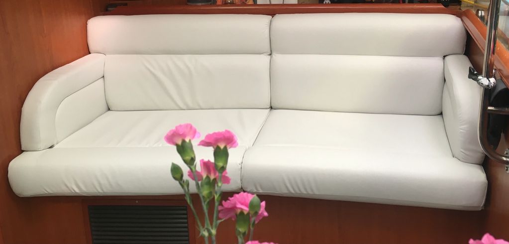 Reupholstered cushions and arm rests for sailboat salon. Loveseat.