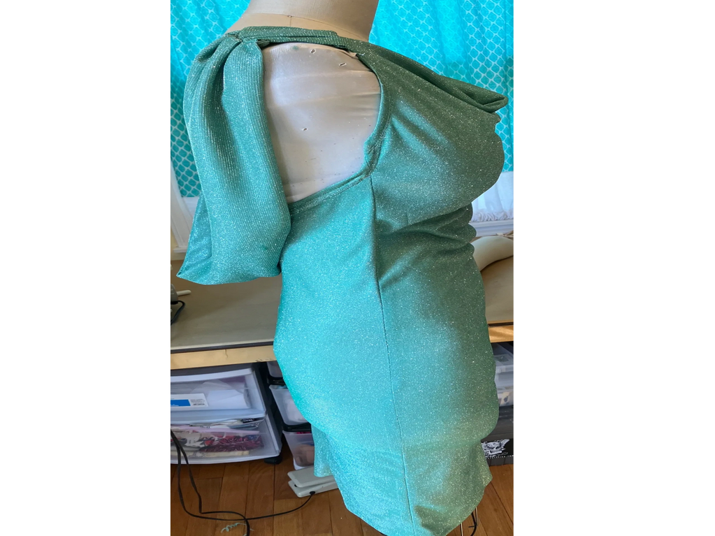 Custom Made Mermaid Green Sparkle cocktail dress. Side View.